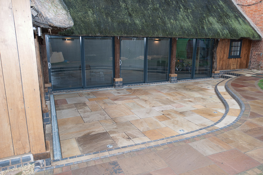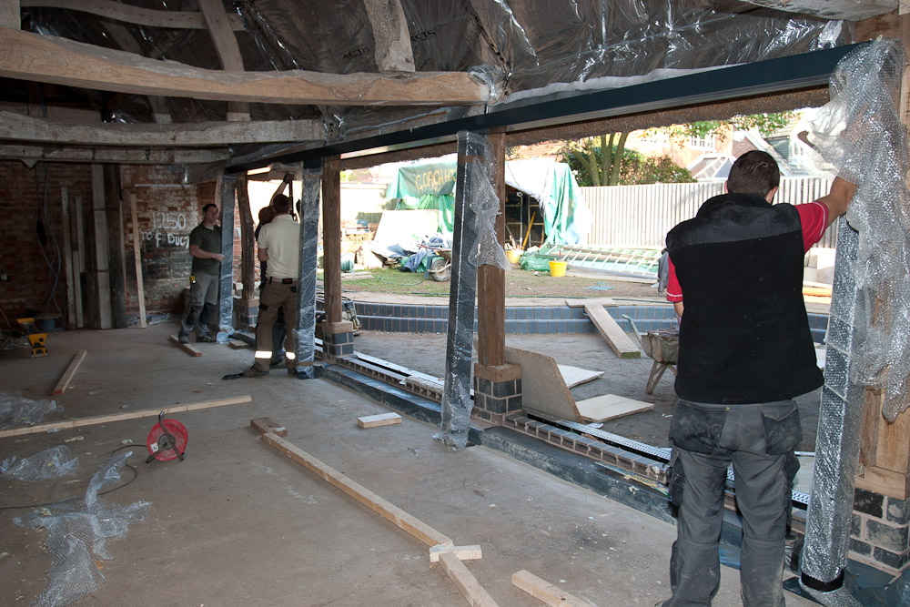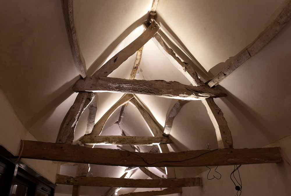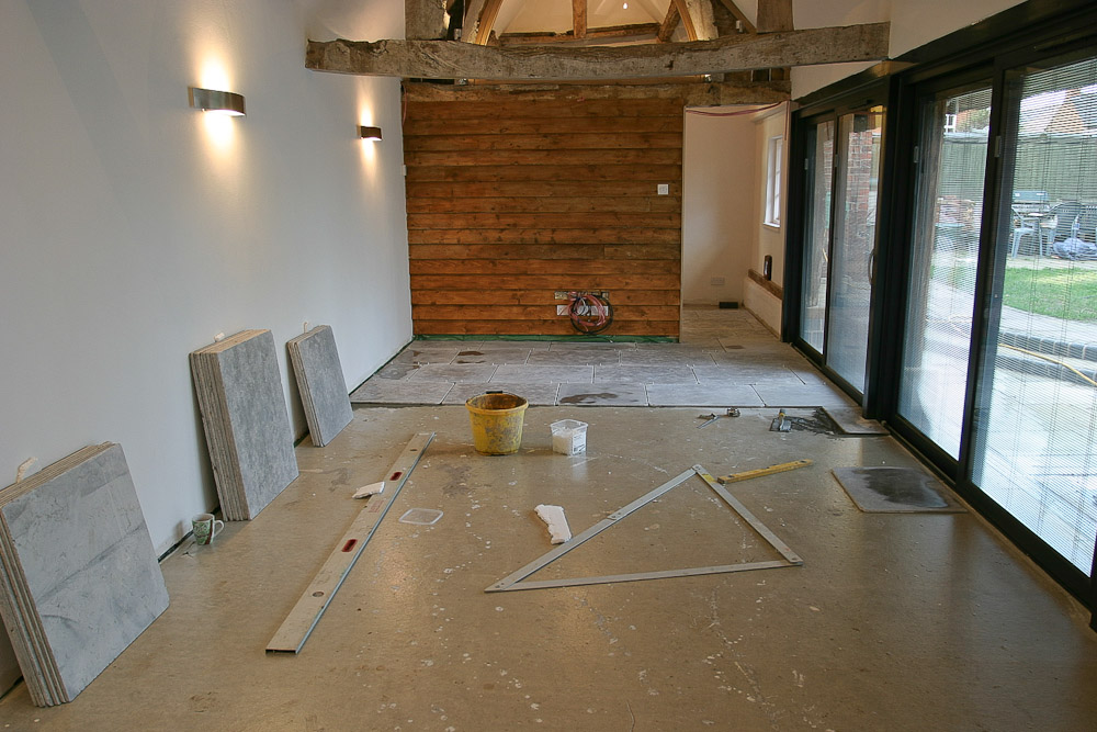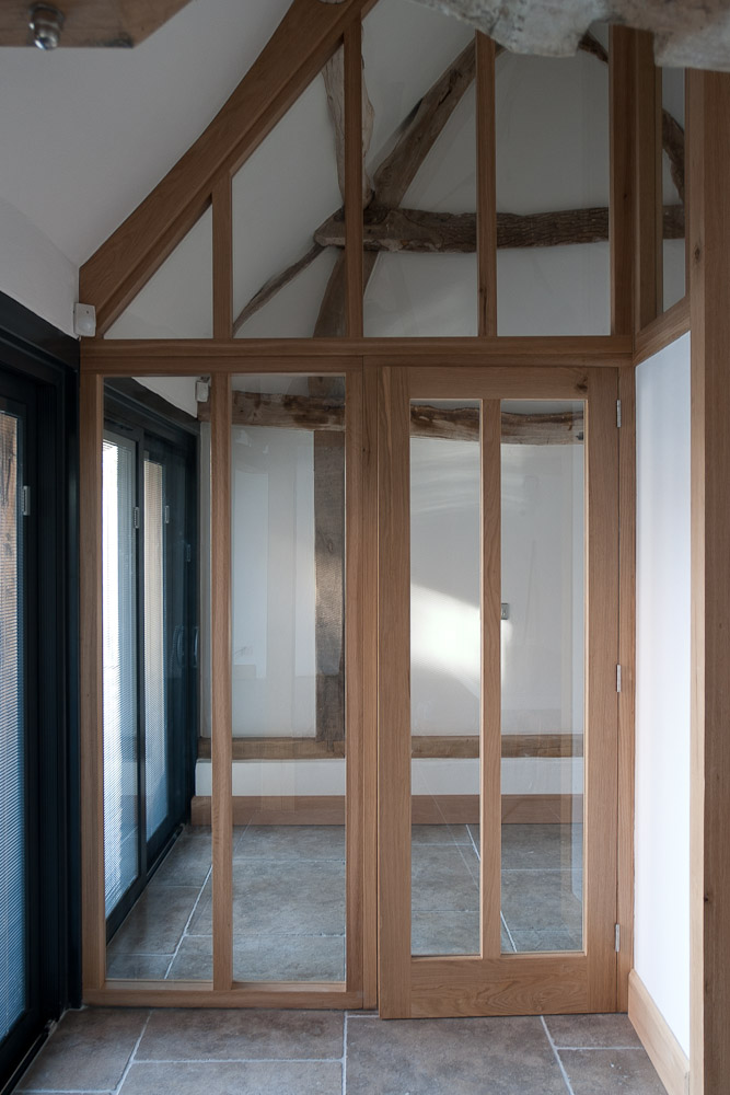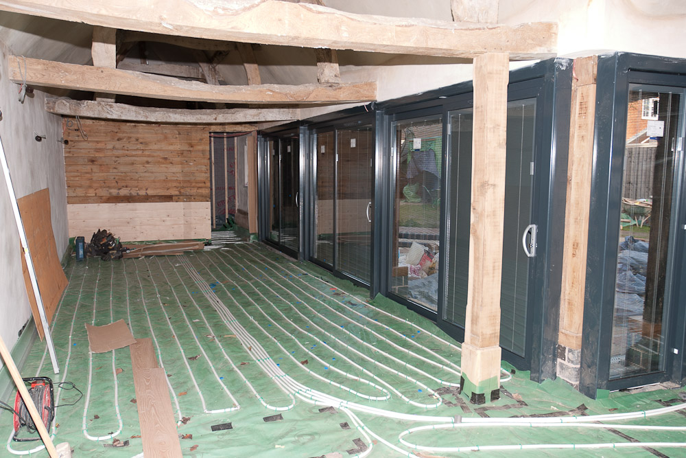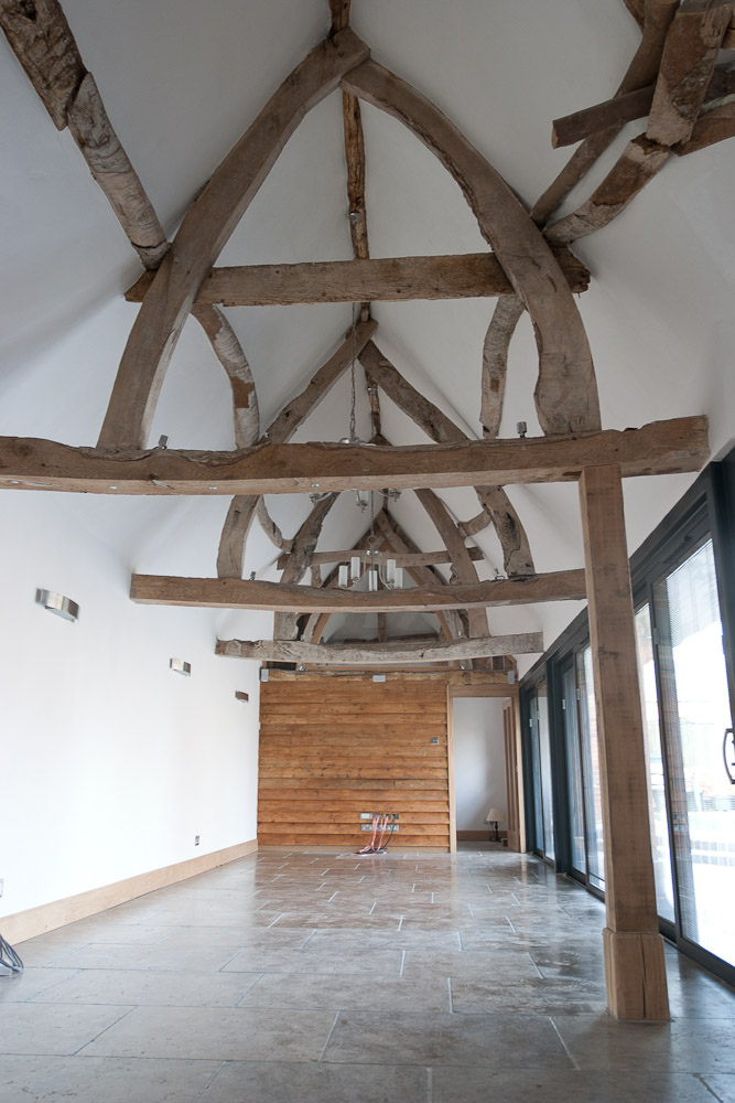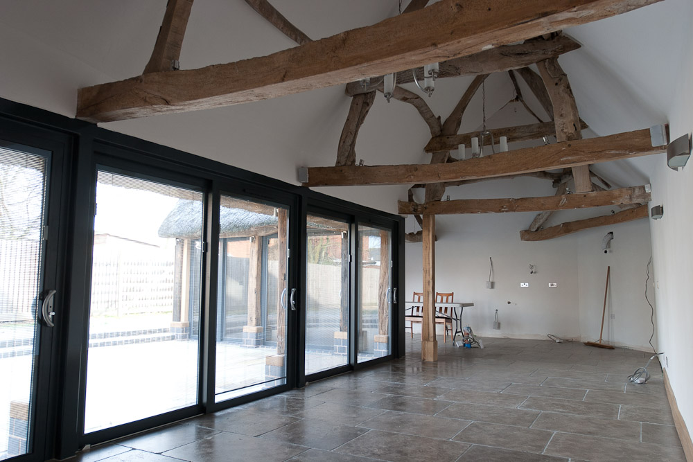 The resulting conversion featured exposed roof timbers illuminated by feature architectural spot lighting, traditional lime plaster walls and ceilings, extensive aluminium sliding patio doors with venetian blinds integrated into the double glazed panels and underfloor-heated tumbled limestone flooring throughout.