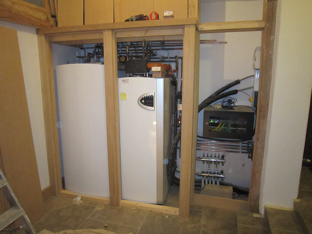 One noteworthy aspect of this project is the inclusion of a ground source heat pump based heating system, where low grade heat is extracted from the ground using a series of fluid filled collector pipes buried 1m below ground. From this, high grade heat is then generated using a heat pump unit, enough to provide all the heating and domestic hot water requirements for the whole house. The heat pump is very efficient and it is possible to generate 4 units of heat for every 1 unit of electricity used to power the system.